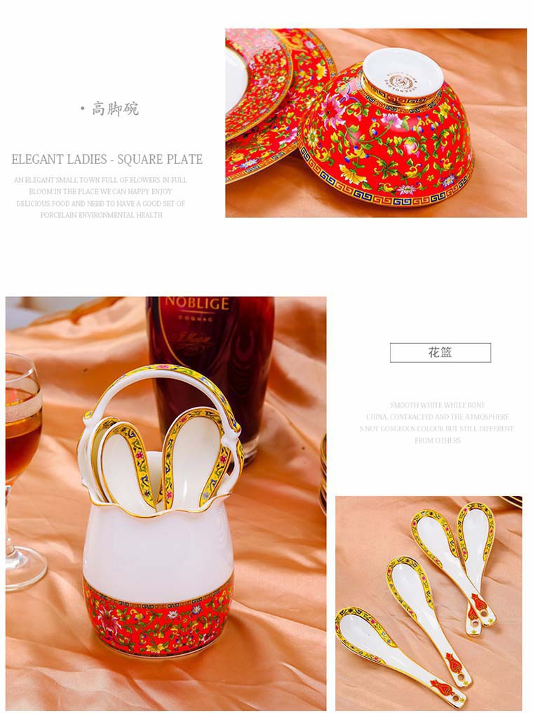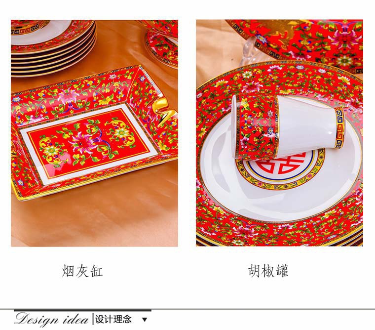85頭琺瑯彩新娘餐具,一個湯煲,一個飯勺,一個魚盤,一個10.5寸平盤,一個10.5寸月光盤,雙層果盤一個,一個大煙缸,一個小煙缸,二個調(diào)料罐,一個牙簽筒,四個面碗,十個4.5寸飯碗,十個三寸調(diào)味碟,十個4寸湯碗,十個調(diào)羹,十個7寸骨碟,十個8寸盤,十個筷子架。