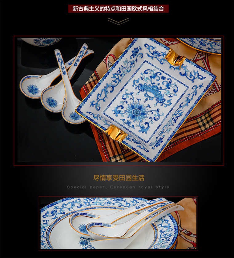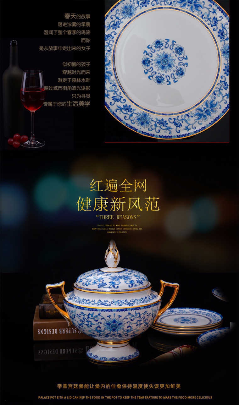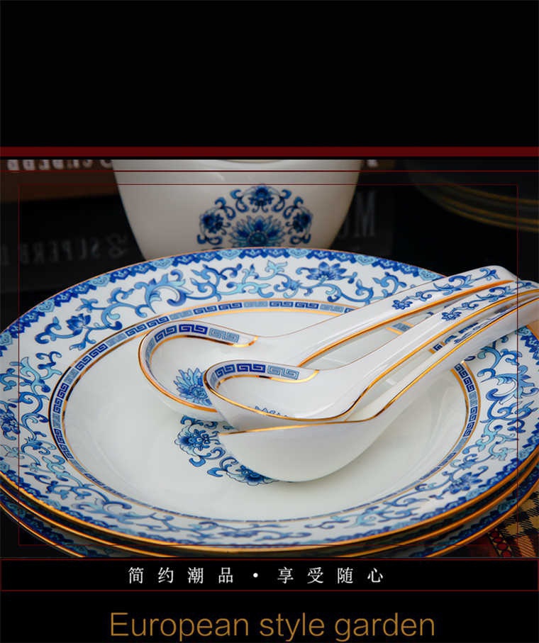 90頭青花餐具,一個宮廷湯煲,一個十二寸魚盤,一個10寸平盤,一個10寸月光盤,一個9寸平盤,一個9寸湯盤,四個8寸平盤,四個8寸湯盤,四個6寸高腳面碗,十個4.5寸飯碗,十個4寸湯碗,十個7.5寸淺盤,十個4寸小蝶,十個筷架,十個天鵝小勺,一個天鵝大勺,一個花籃,兩個胡椒瓶,一個牙簽筒,一個大煙灰缸,一個雙層水果盤,一個美鵝,一個毛巾碟,兩個燉盅。