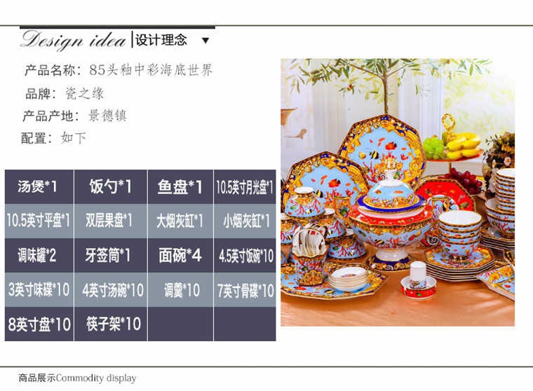 85頭釉中彩海底世界,一個湯煲,一個飯勺,一個魚盤,一個10.5寸平盤,一個10.5寸月光盤,雙層果盤一個,一個大煙缸,一個小煙缸,二個調(diào)料罐,一個牙簽筒,四個面碗,十個4.5寸飯碗,十個三寸調(diào)味碟,十個4寸湯碗,十個調(diào)羹,十個7寸骨碟,十個八寸盤,十個筷子架。