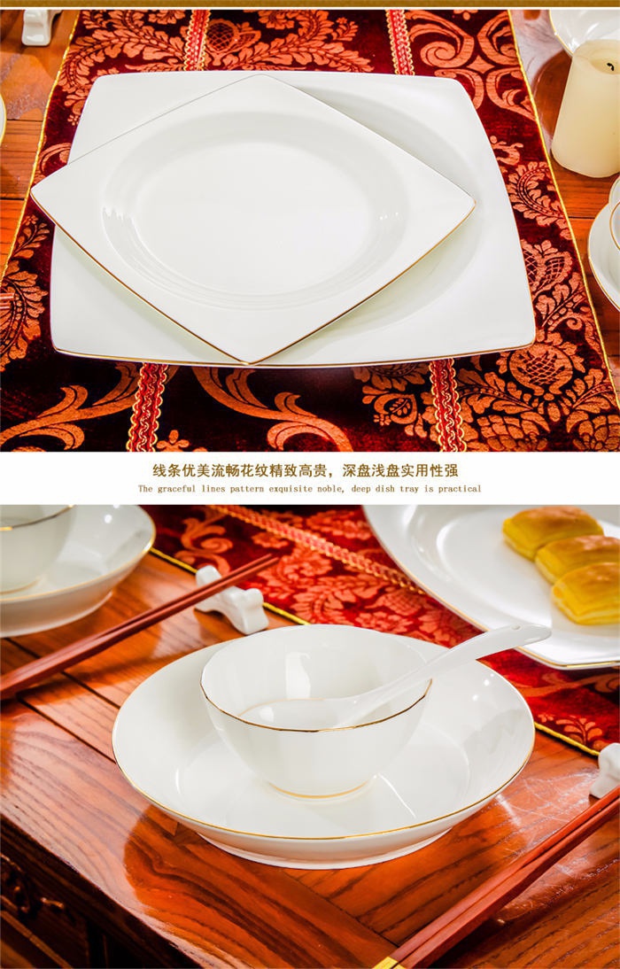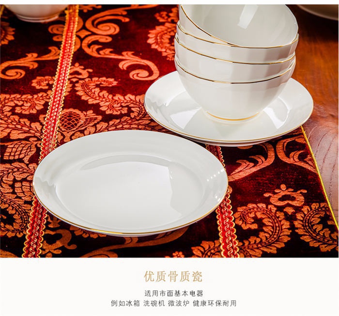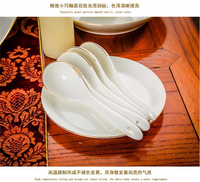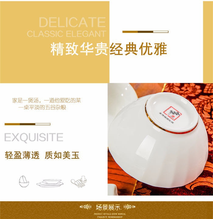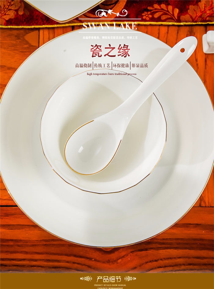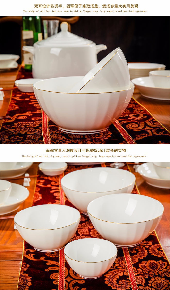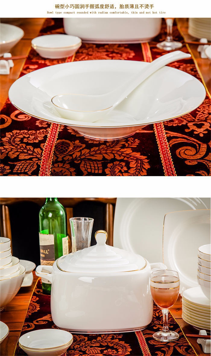 66頭純白描金,一個湯煲,一個魚盤,一個十寸圓盤,一個飯勺,一個煙灰缸,一個牙簽筒,七個面碗,十個4.5寸飯碗,十個八寸深盤,