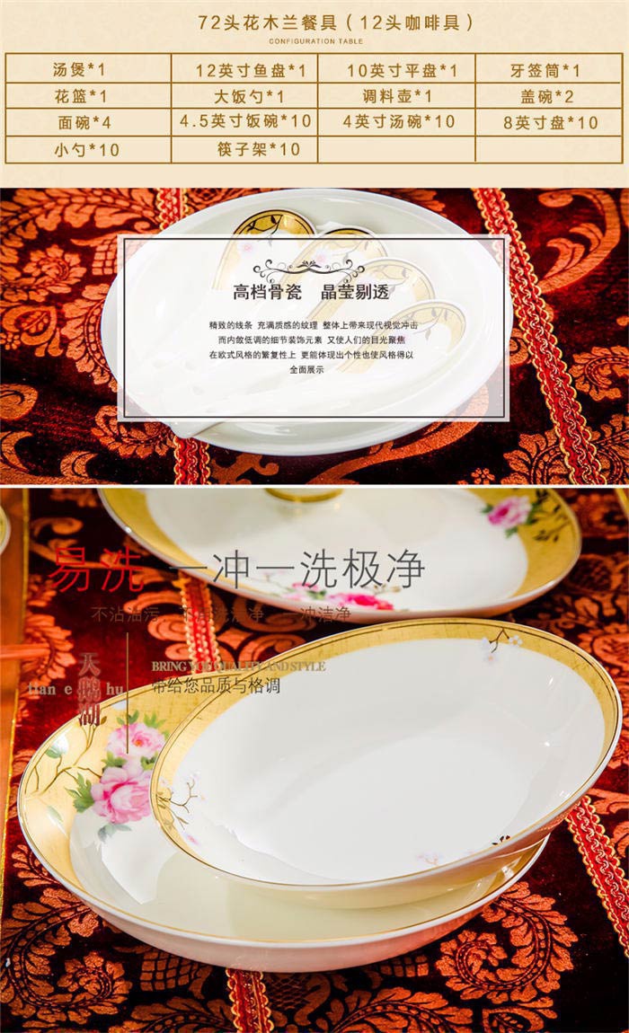 72頭花木蘭餐具,餐具60頭 ,一個湯煲,一個魚盤,一個十寸圓盤,一個牙簽筒,一個花籃,一個大飯勺,兩個調(diào)料壺,兩個蓋碗,四個碗,十個4.5寸飯碗,十個4寸湯碗,十個8寸盤,十個調(diào)羹,十個筷子架,