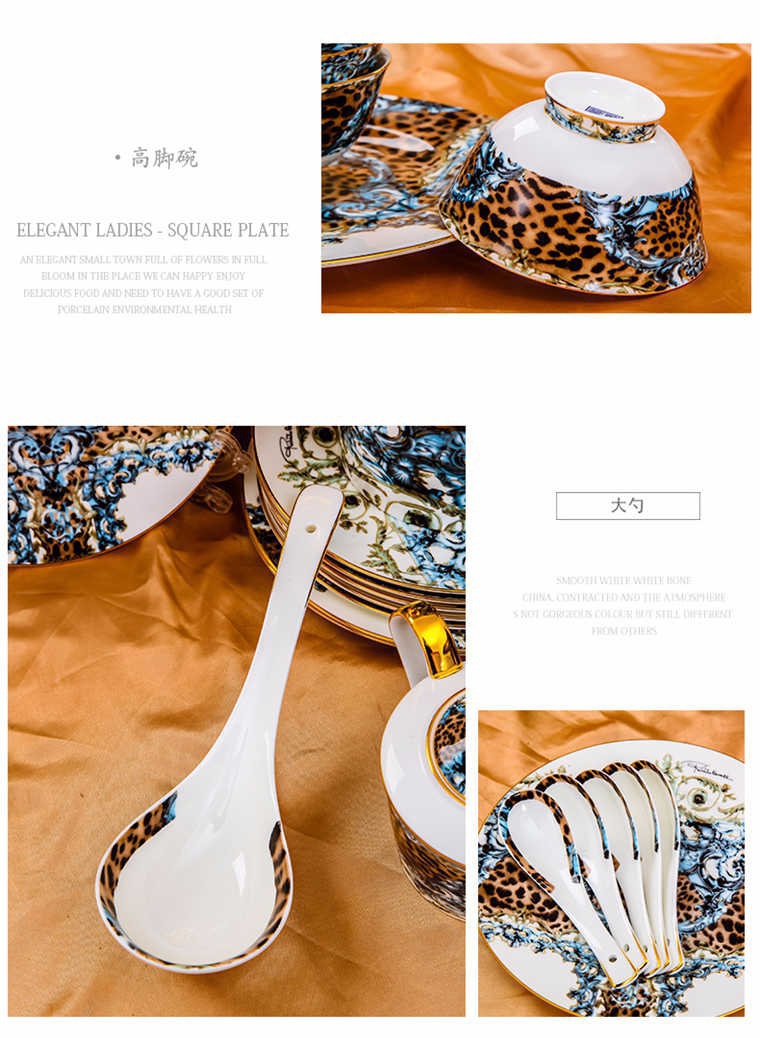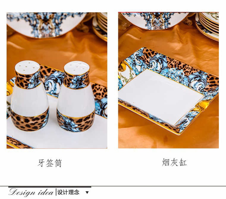 71頭范思哲豹紋餐具,一個湯煲,一個大湯碗,一個大湯勺,一個煙缸,兩個胡椒瓶,一個魚盤,一個10寸盤,六個9寸深盤,六個8寸平盤,六個8寸月光盤,十個4.5寸飯碗,十個小勺,十個筷子架,一個咖啡壺,一個糖缸,一個奶罐,六個咖啡杯,六個碟。